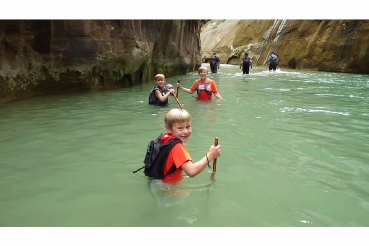 The Riverside Walk Trail is a level, paved one mile trail that meanders along the Virgin River. When the Riverside Trail comes to a dead end at the river's edge, you just step into the river and keep going. The Narrows Trail is not a 'marked' trail. It simply follows the Virgin River upstream through the canyon. The boys, ages 13, 9, and 7, were giddy with the anticipation of being allowed to walk through the river all day.